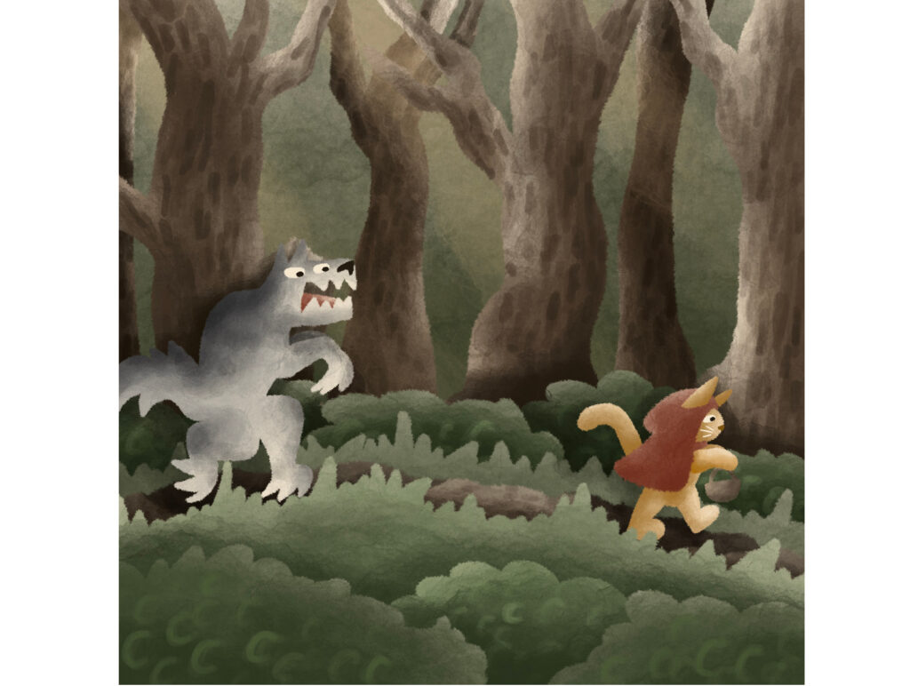 In this retelling of Little Red Riding Hood, the colors are desaturated and the shadows are intensified to mimic the darkness of the story’s end. Growing up, when I read Little Red Riding Hood, good usually prevailed, with someone or something saving Little Red Riding Hood and her grandmother. However, in reality, this does not always happen. Thus, I decided to take on a “Grimm Brothers'” approach to the ending. This choice allows for the audience to begin thinking about big topics such as ignorance, naivety, and consequences.