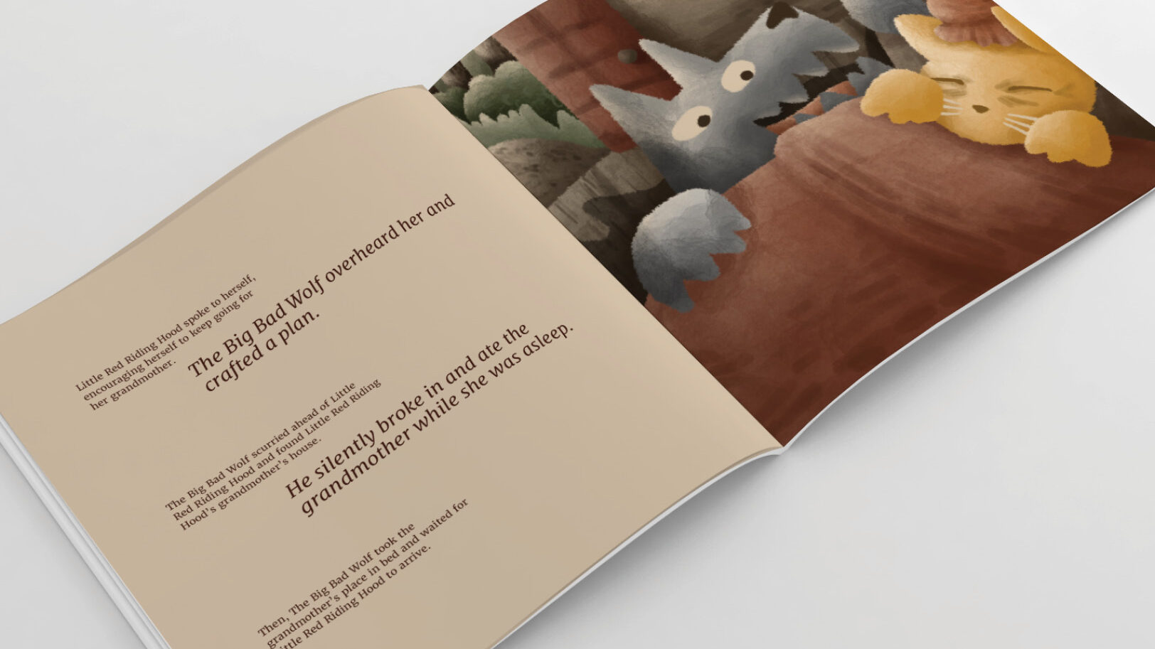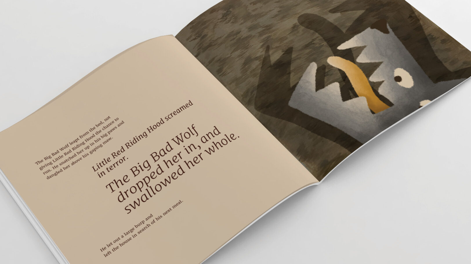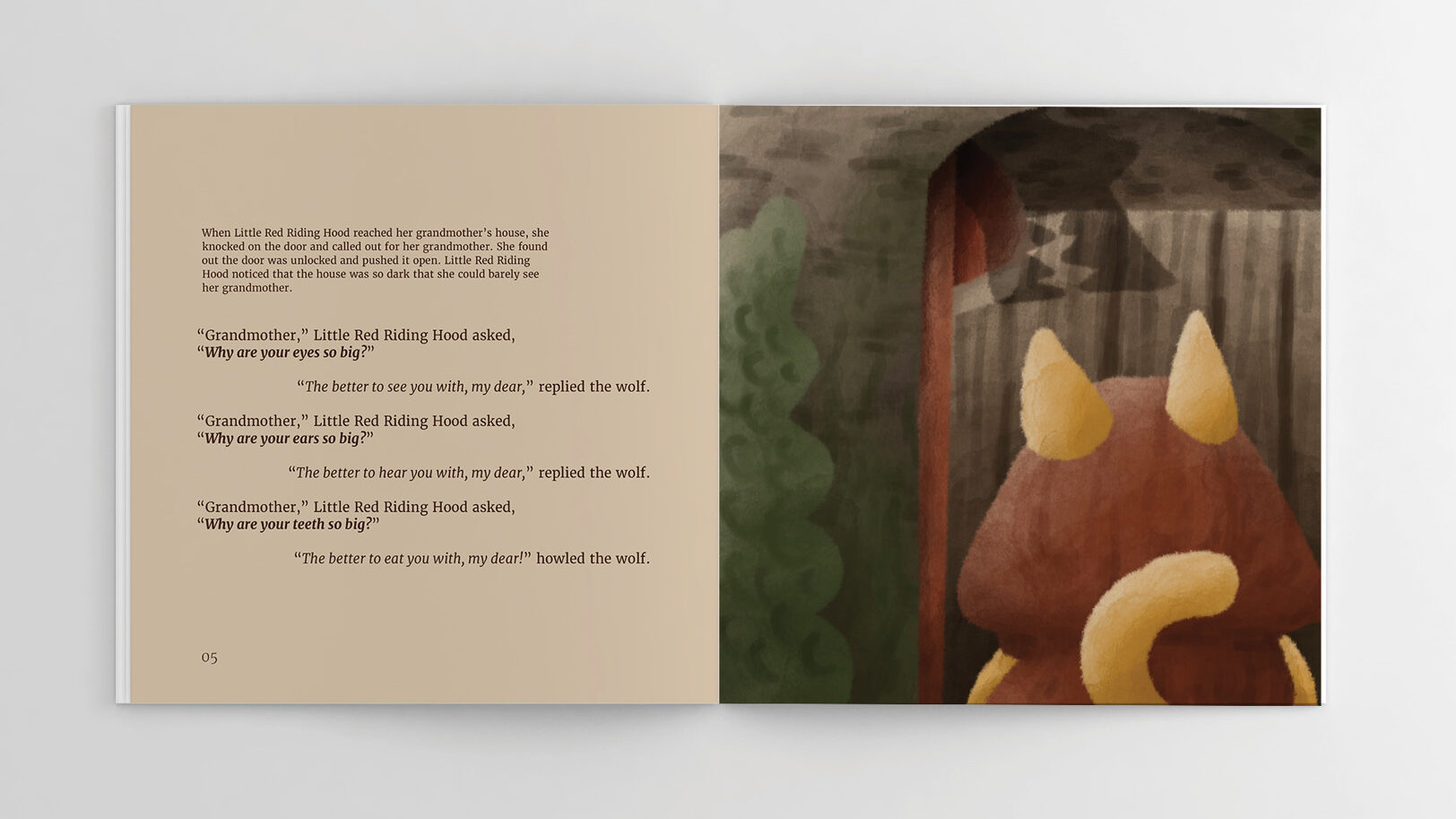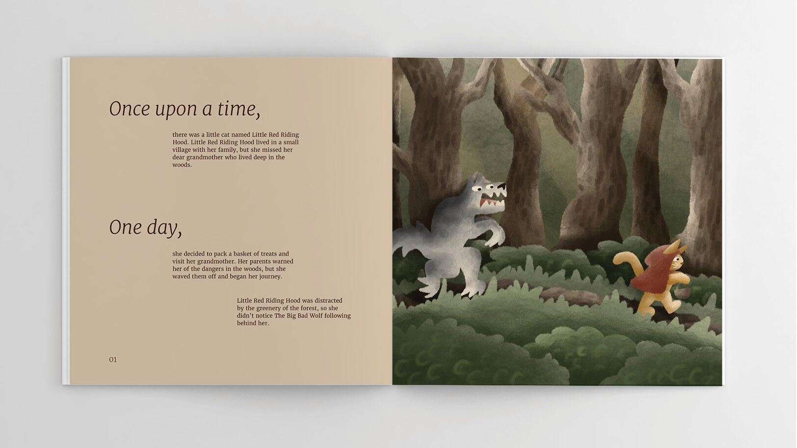When thinking about what kind of story I wanted to retell, I recalled an old children’s storybook that held a variety of classic tales. In particular, as a kid, I was drawn to the story of “Little Red Riding Hood” due to the detail put in to the the forest scenes. Thus, putting my own spin on “Little Red Riding Hood” seemed like the most exciting choice for me.
